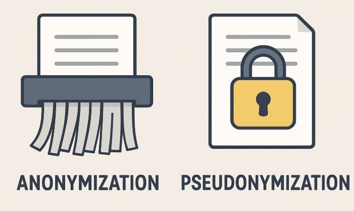 Pseudonymization is the process of replacing personal identifiers with artificial identifiers (like codes or random IDs) while keeping a separate key to re-identify the person if needed. It’s reversible if you have the mapping key. e.g “John Smith” becomes “Patient_0098” in the dataset, but a separate file links “Patient_0098” back to “John Smith.”